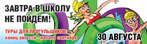 30 августа, перед самым началом осени и учебного года, мы проводим акцию Бамбарбия под кодовым названием «Завтра в школу не пойдем!». Это акция для всех, кто хочет купить недорогие горящие путевки и отлично отдохнуть в бархатный сезон!